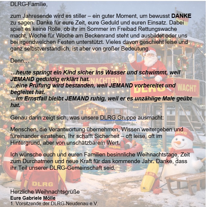 im Jahr 2024 stehen bei uns in der DLRG-Neudenau e.V. wieder Wahlen an. Wir brauchen dringend Unterstützung, sowohl bei den Trainern als auch in der Vorstandschaft und bei den Rettungsschwimmern. Bei Fragen kommt gerne auf uns zu. Wir freuen uns über jeden, der uns in irgendeiner Art unterstützen kann.